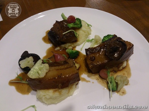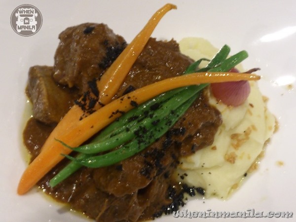 Beef Shortribs Caldereta in Red Wine – braised beef shortribs, baby vegetables, pickled shallots
